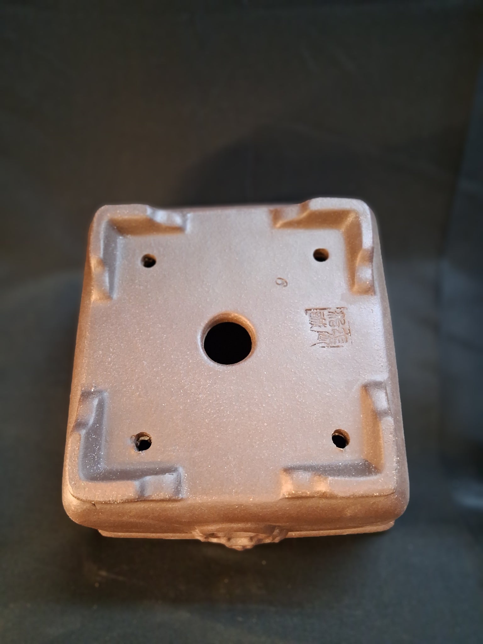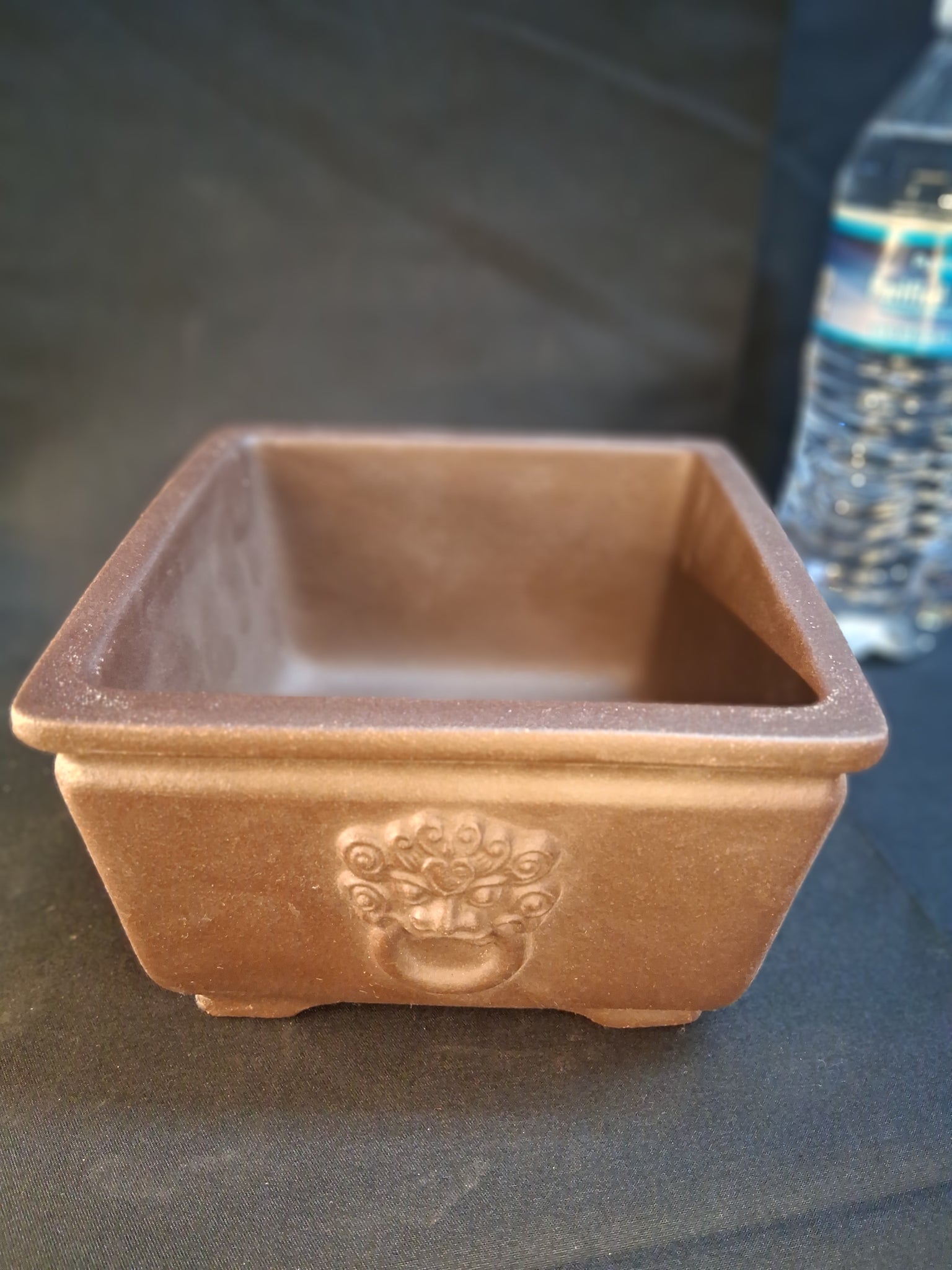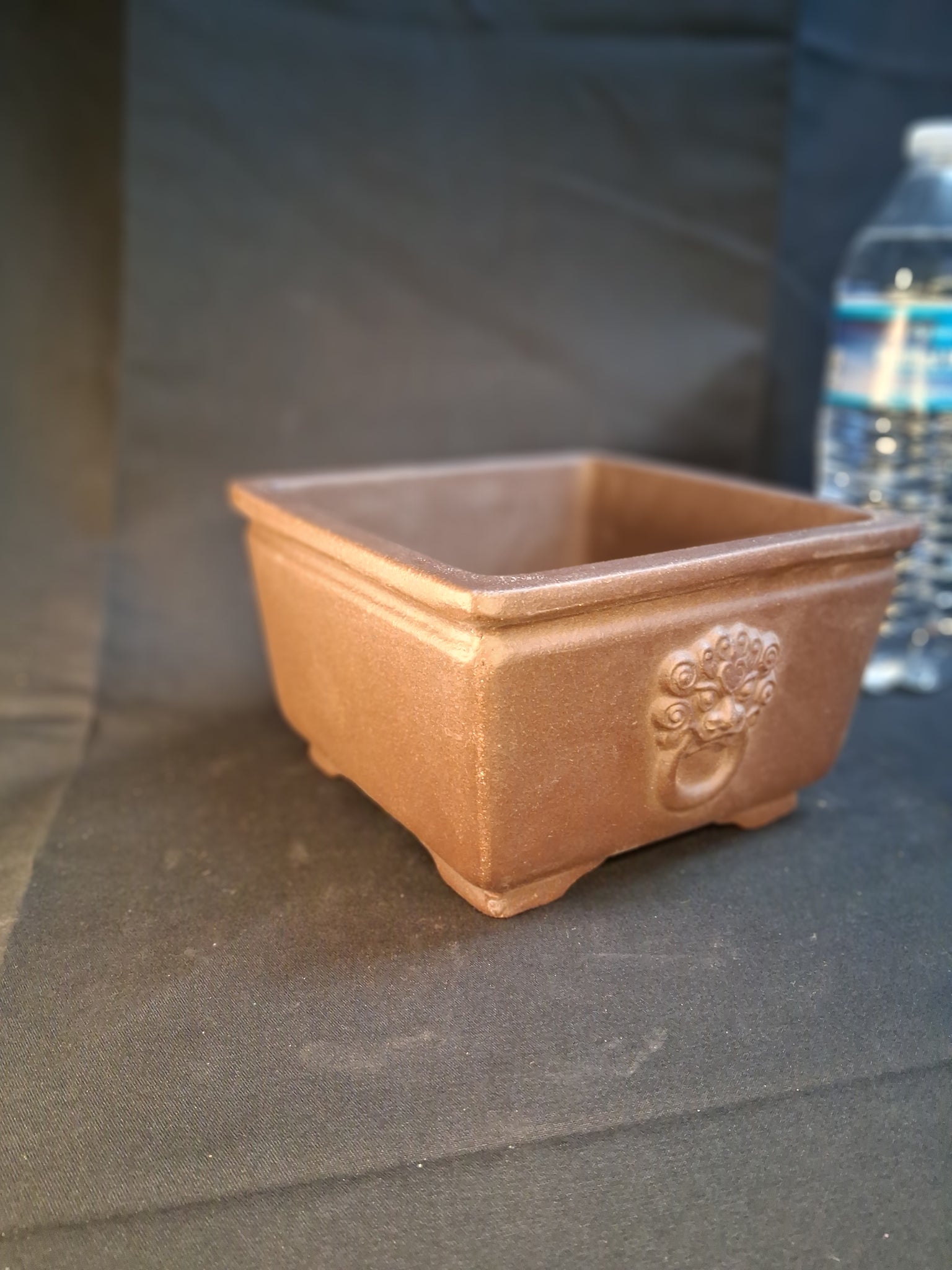 Square unglazed semi cascade or deeper traditional pot depicting a traditional chinese guardian lion or 'Foo Dog' on two sides. Square pot. Approximate dimensions inside: 5" x 3".