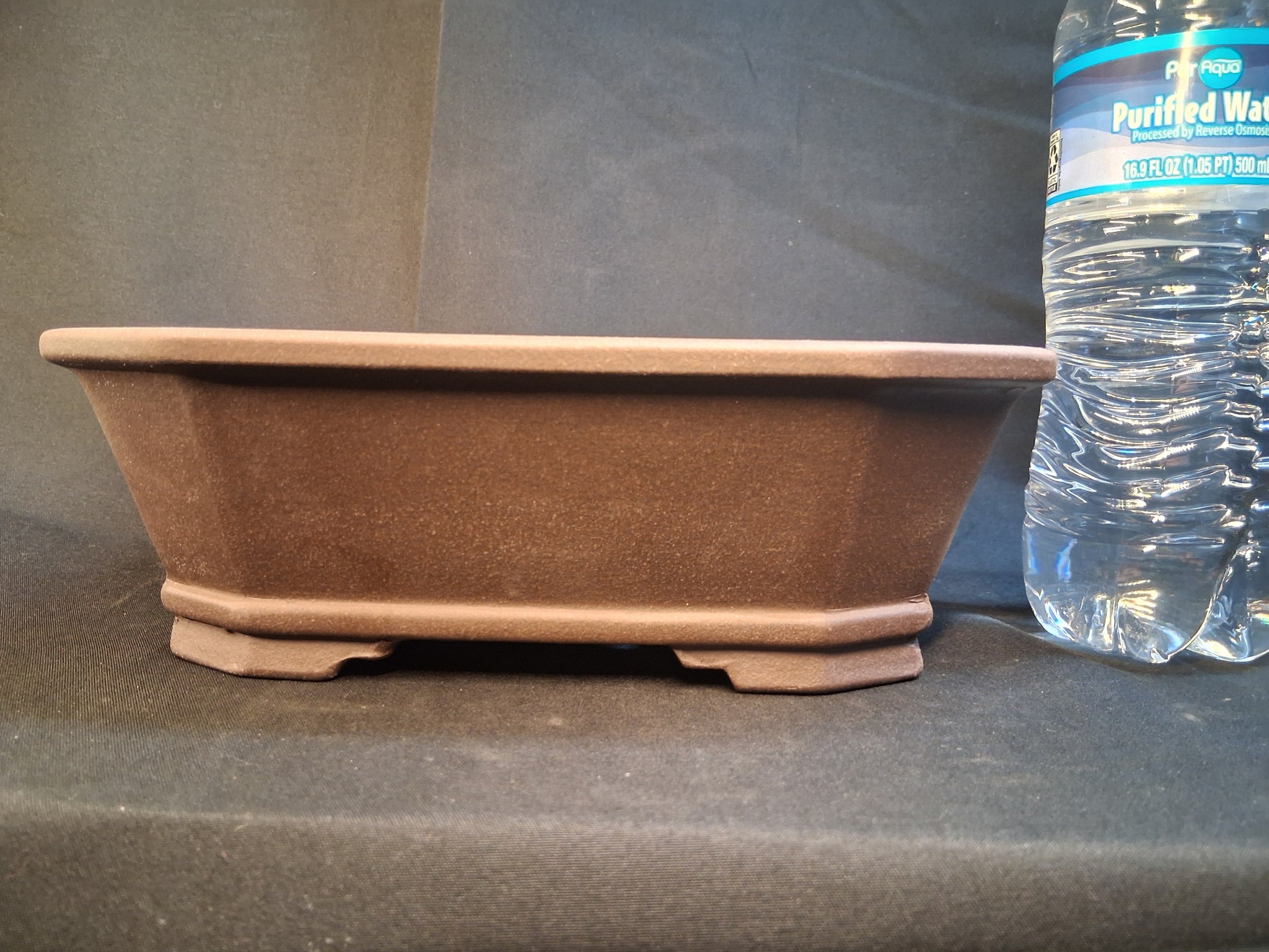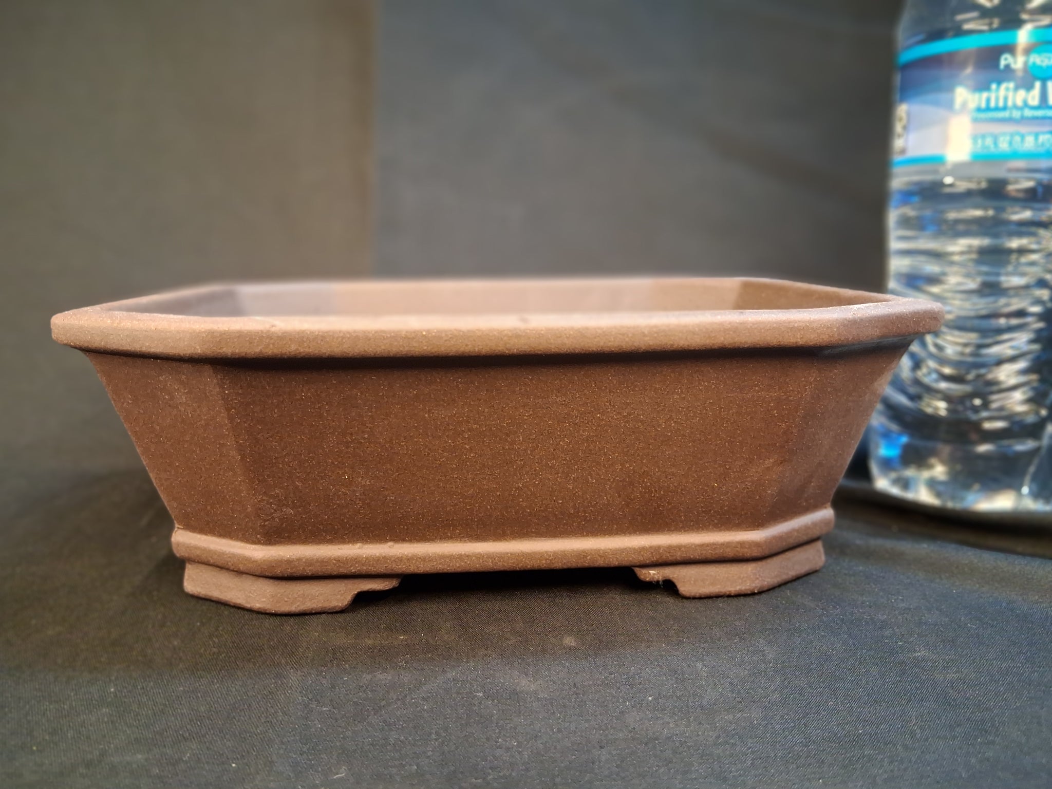 Rectangular unglazed bonsai pot with cut corners.